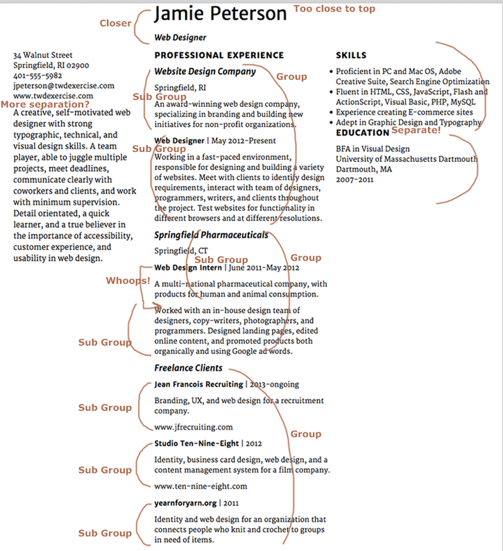 Mark up a screenshot of the resume so far. What needs to be grouped together? What spaces need to increase? What spaces need to decrease?