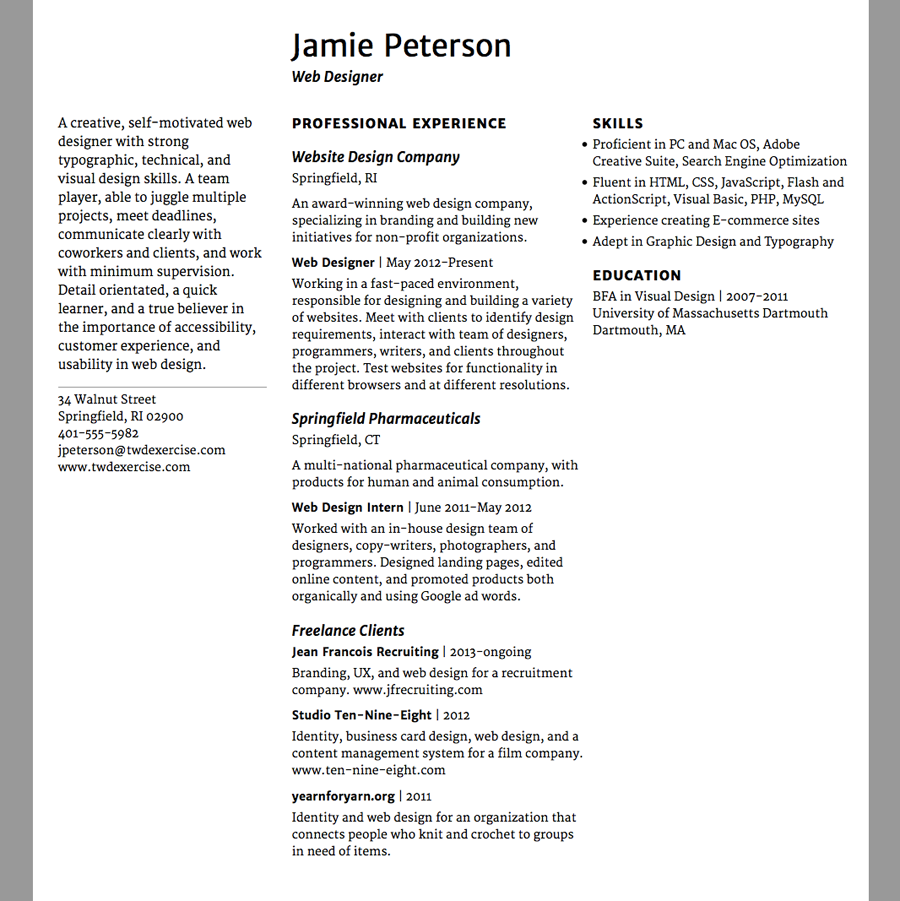 In this exercise, you’ll modify the resume you set up in the last lesson, so make a copy of the resume_hierarchy folder and name the new folder resume_spacing. Keep it in your web_typography folder.